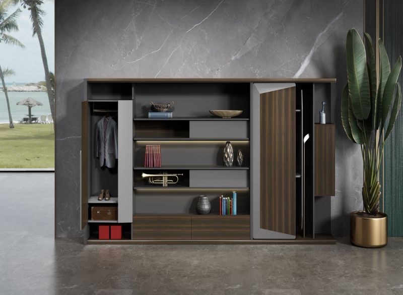 1、貼面材料:采用澳大利亞珍稀的尤加利原木本色為基色,先進的歐洲染色工藝、配上實色金屬啞光高溫烤漆,紋理精致清晰 2、封邊用材:與貼面相同的木皮封邊; 3、基材:采用“上思華林”E0級高密度板; 4、油漆:面漆采用“華潤”PU聚脂漆; 5、五金配件:德國進口BMB品牌緩沖導軌、BMB緩沖門鉸;歐派克旗艦5號或圖特T312緩沖趟門配件;臺面配黑拉絲走線盒及黑拉絲裝飾鋁板;隱藏式走線功能; 6、特殊工藝:底部采用大斜邊工藝,由巴吉5軸數(shù)控中心加工完成、暗藏燈帶,配獨立控制遙控器